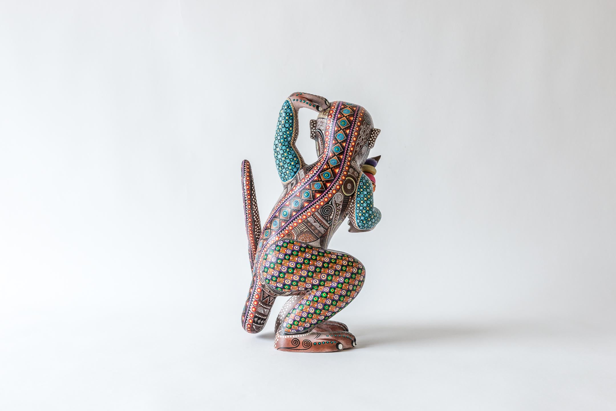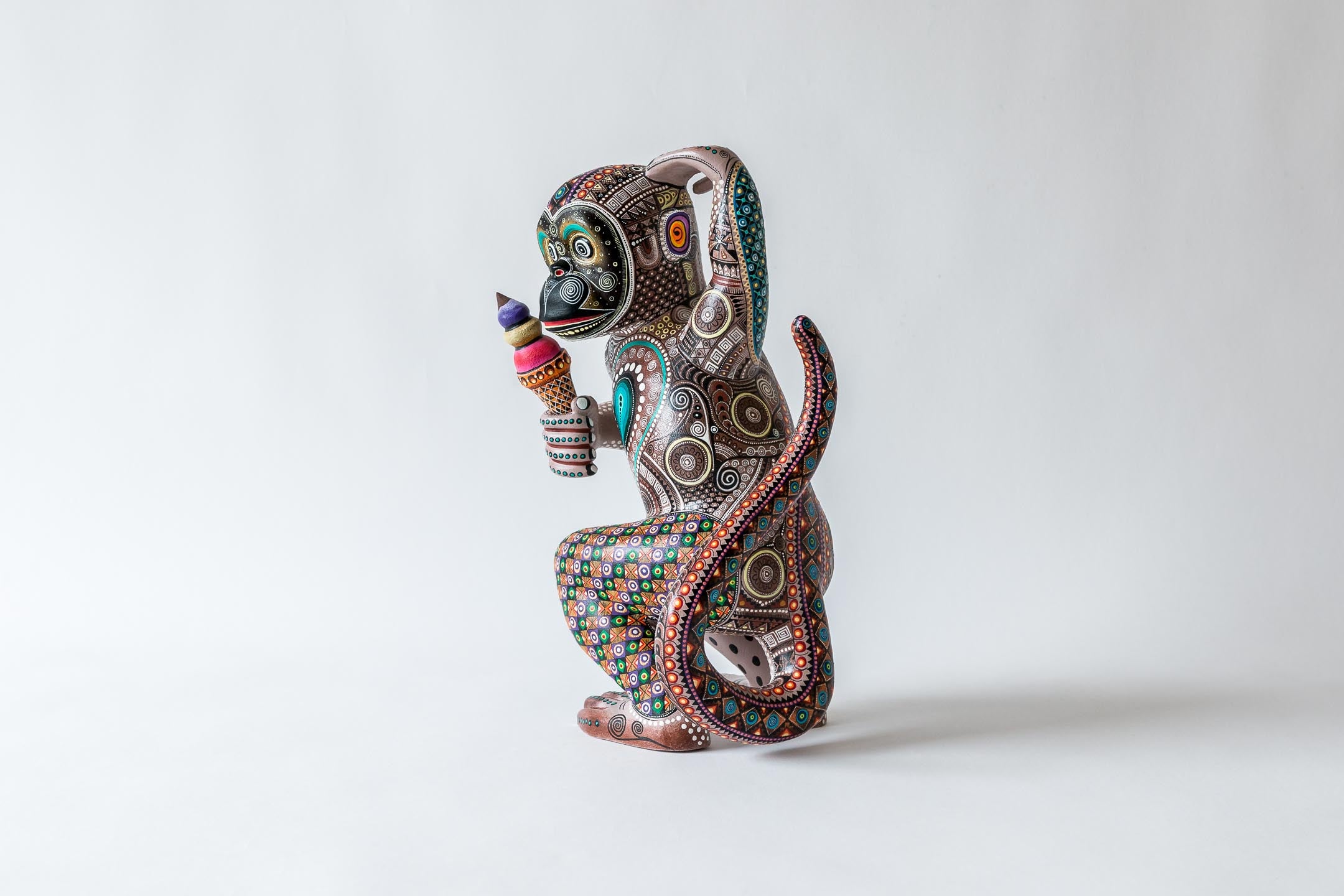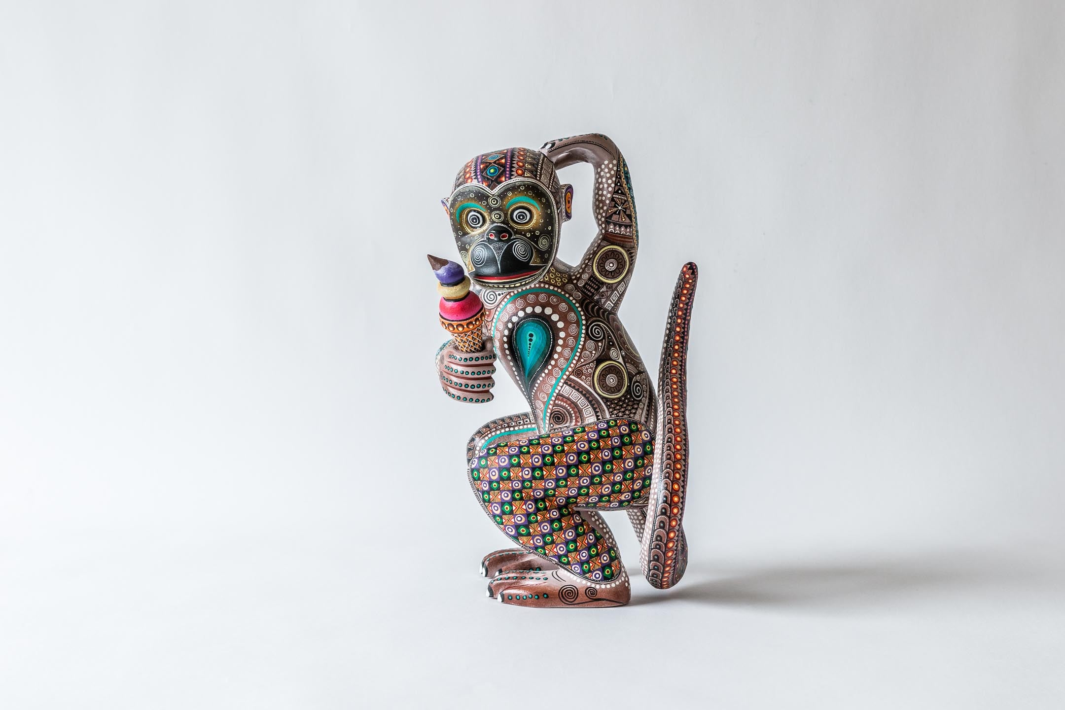 This is the first in a series of monkeys with an attribute (here a separately carved ice cream cone) that Manuel is making for OO. For larger works one has to be patient as the drying of the wood takes time before carving. After the carving it takes again more time to be prepared for the final process of painting. Painting is carried out by Manuel's wife Rubi. In this piece both carving and painting have made a perfect object.